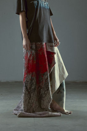 Asymmetrical patchwork wrap skirt. Acrylic, oil and bleach on cotton.